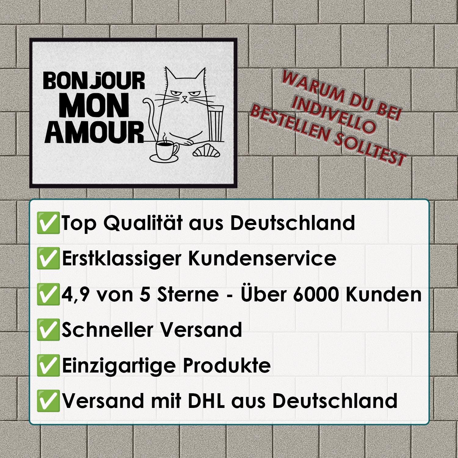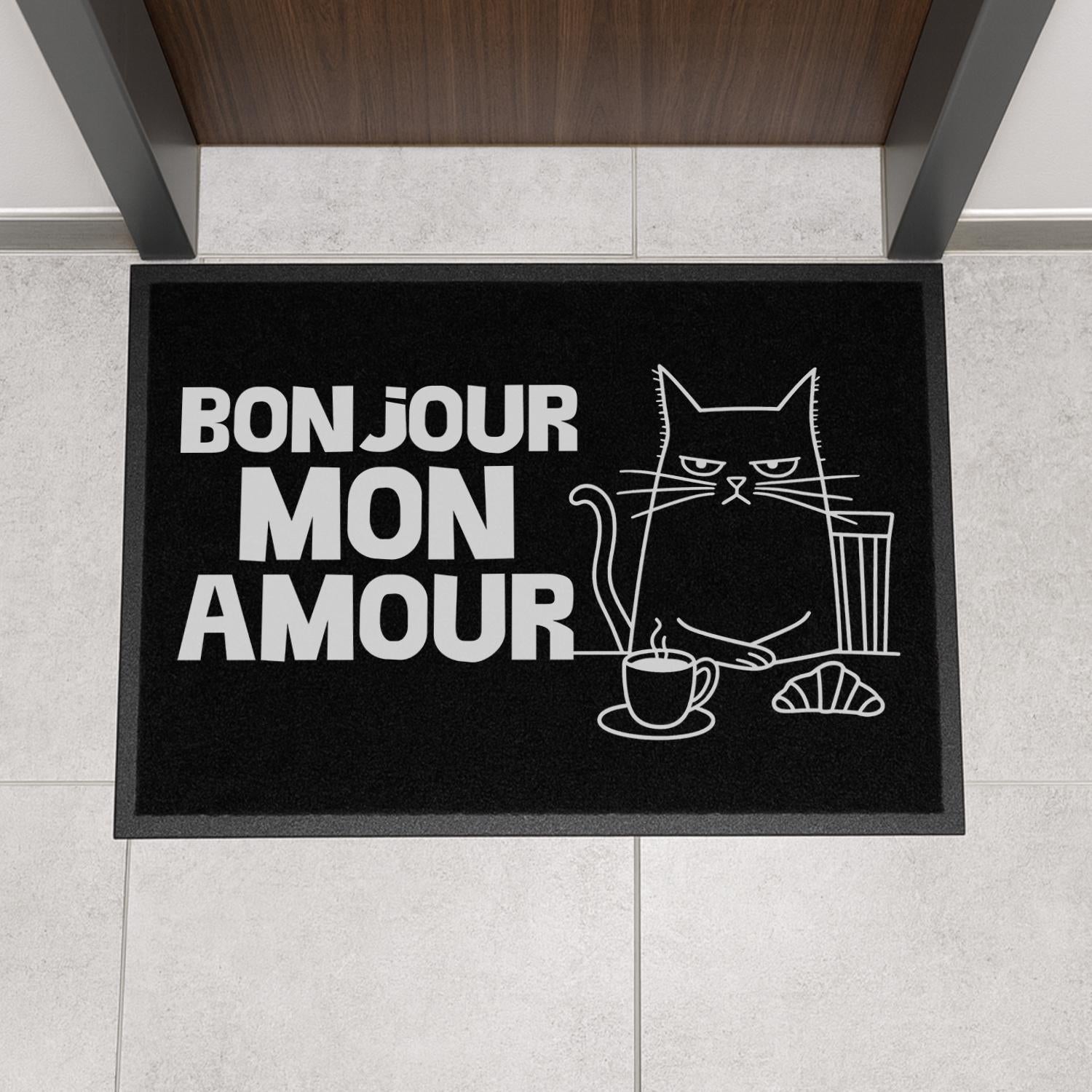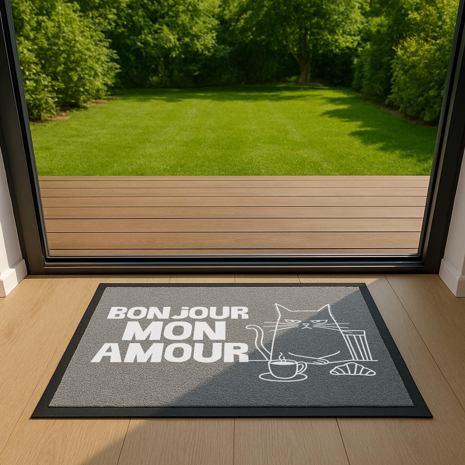 Ein genervter Blick, ein kurzer Gruß und jede Menge Charme: Diese Fußmatte Katze Bonjour Mon Amour bringt Humor und Stil direkt vor Deine Haustür. Die Illustration zeigt eine Katze mit herrlich skeptischem Gesichtsausdruck, darunter steht der liebevolle Spruch Bonjour Mon Amour. So vereint die Matte französische Leichtigkeit mit Katzenhumor – und sorgt dafür, dass Gäste schon beim Eintreten schmunzeln. Robust und pflegeleicht hält sie Schmutz draußen, während sie drinnen für gute Laune sorgt.