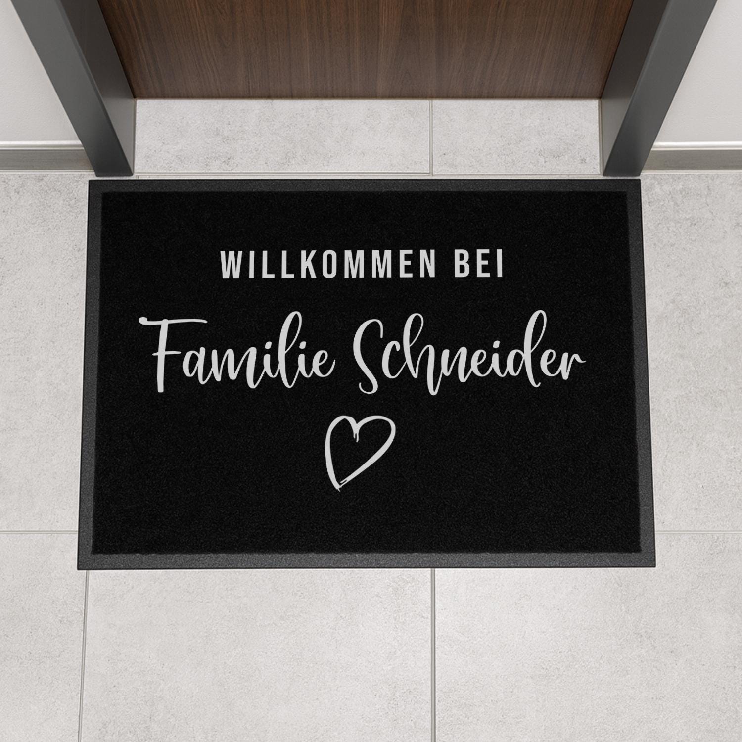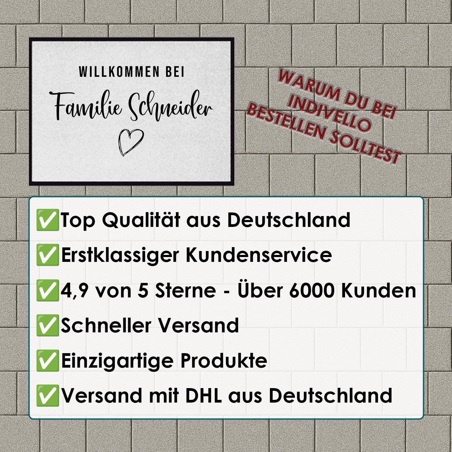 Ein Zuhause beginnt mit einem herzlichen Empfang – und genau das macht diese personalisierte Fußmatte möglich. Mit dem Schriftzug „Willkommen bei Familie Schneider“ (wobei der Nachname selbstverständlich frei wählbar ist) heißt Du Deine Gäste schon an der Tür mit einer persönlichen Note willkommen. Das Design ist schlicht, stilvoll und zugleich individuell – perfekt, um Deinem Eingangsbereich Charakter und Wärme zu verleihen. Praktisch, pflegeleicht und robust sorgt die Matte dafür, dass Schmutz draußen bleibt und ein guter erster Eindruck bleibt.