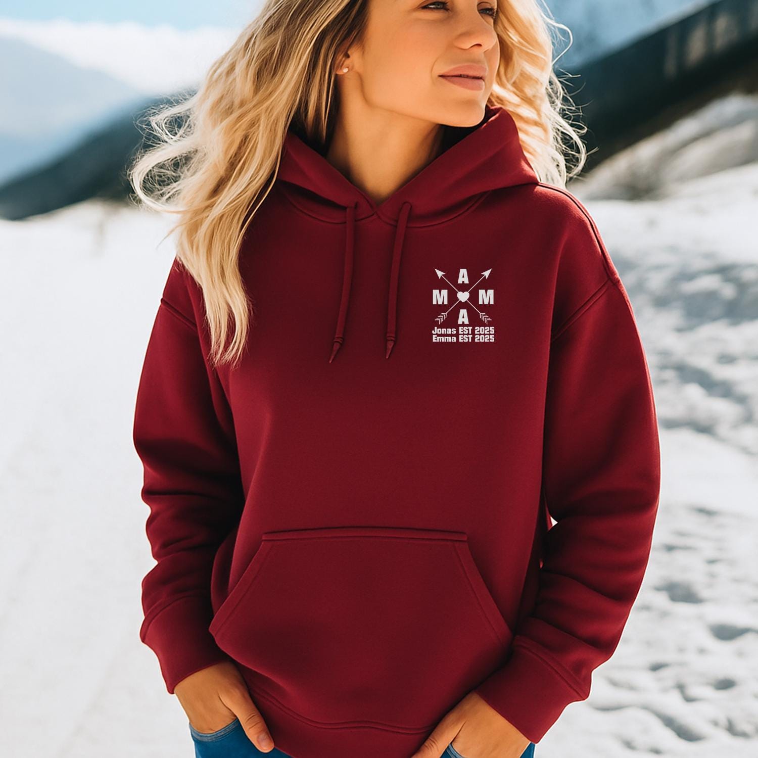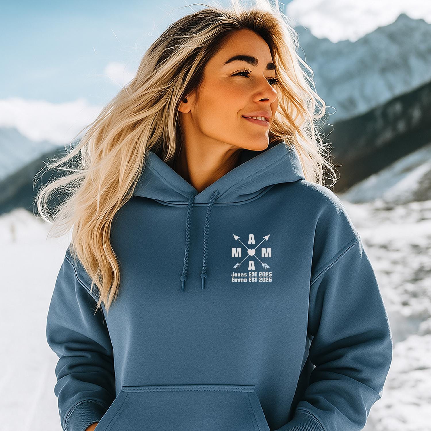 Du suchst nach einem einzigartigen und tollen Weihnachtsgeschenk für Deine Frau? Deine Freundin oder Deine Frau verdient nichts von der Stange, sondern ein personalisiertes Weihnachtsgeschenk für Mama? Dann ist unser Hoodie mit der modischen und doch minimalistischen Personalisierung auf der Brust genau die richtige Wahl. Nenne uns einfach die Namen der Kinder und schon fertigen wir ein Unikat, was Deiner Frau sicherlich die Tränen in die Augen treibt.