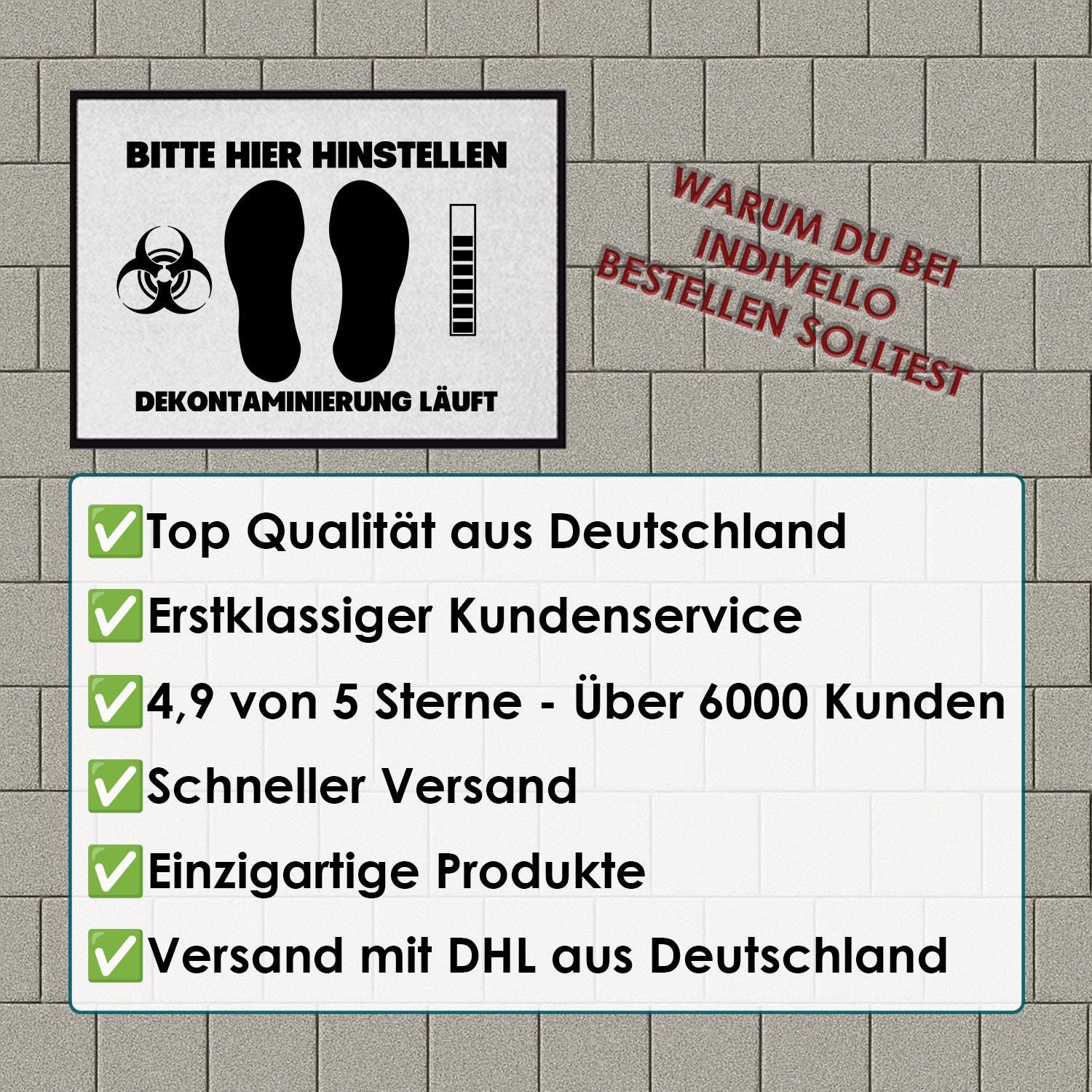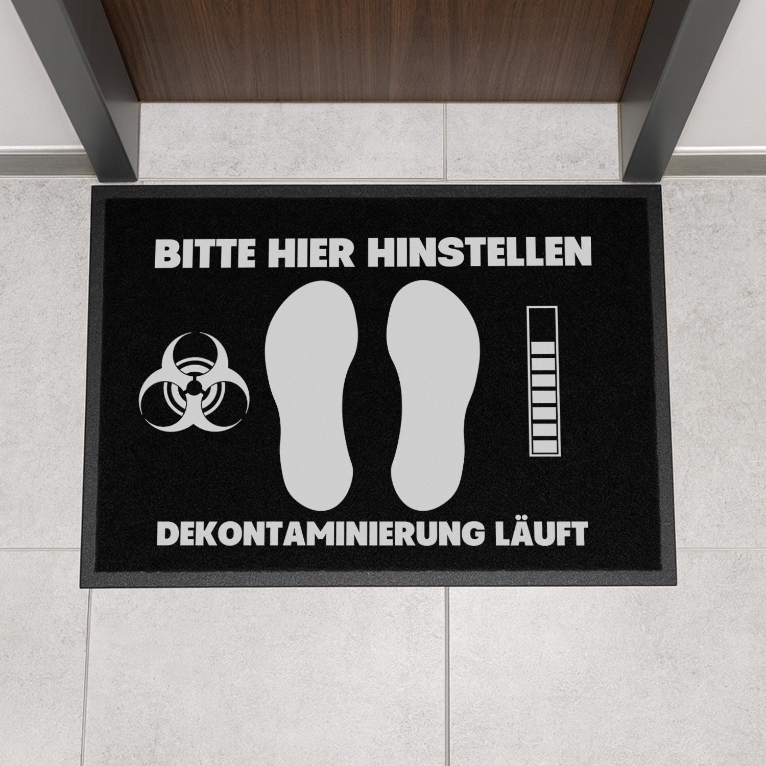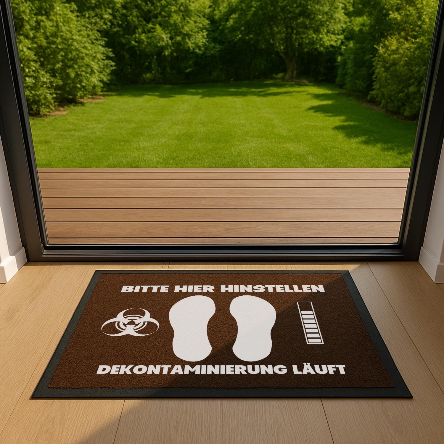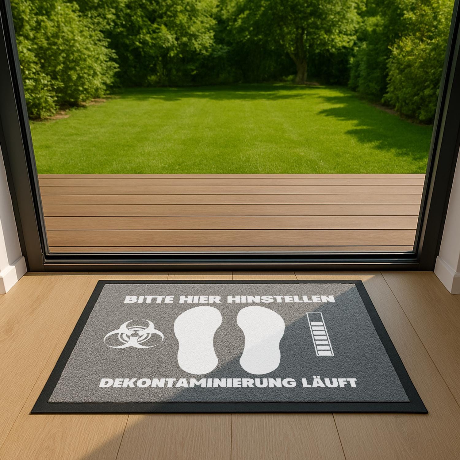 Ein kleiner Spaß im Alltag gefällig? Diese lustige Fußmatte Geschenk zum Einzug bringt Humor direkt vor die Tür. Zwei große Fußabdrücke laden dazu ein, sich darauf zu stellen, während das Biohazard-Symbol und der Ladebalken mit dem Text „Dekontaminierung läuft“ für ein Lächeln sorgen. Perfekt für alle, die es originell mögen und ihren Gästen schon im Eingangsbereich mit Augenzwinkern begegnen wollen. Ob für Freunde, Familie oder die eigene Wohnung – diese Matte macht sofort klar: Hier wohnt jemand mit Sinn für Humor.