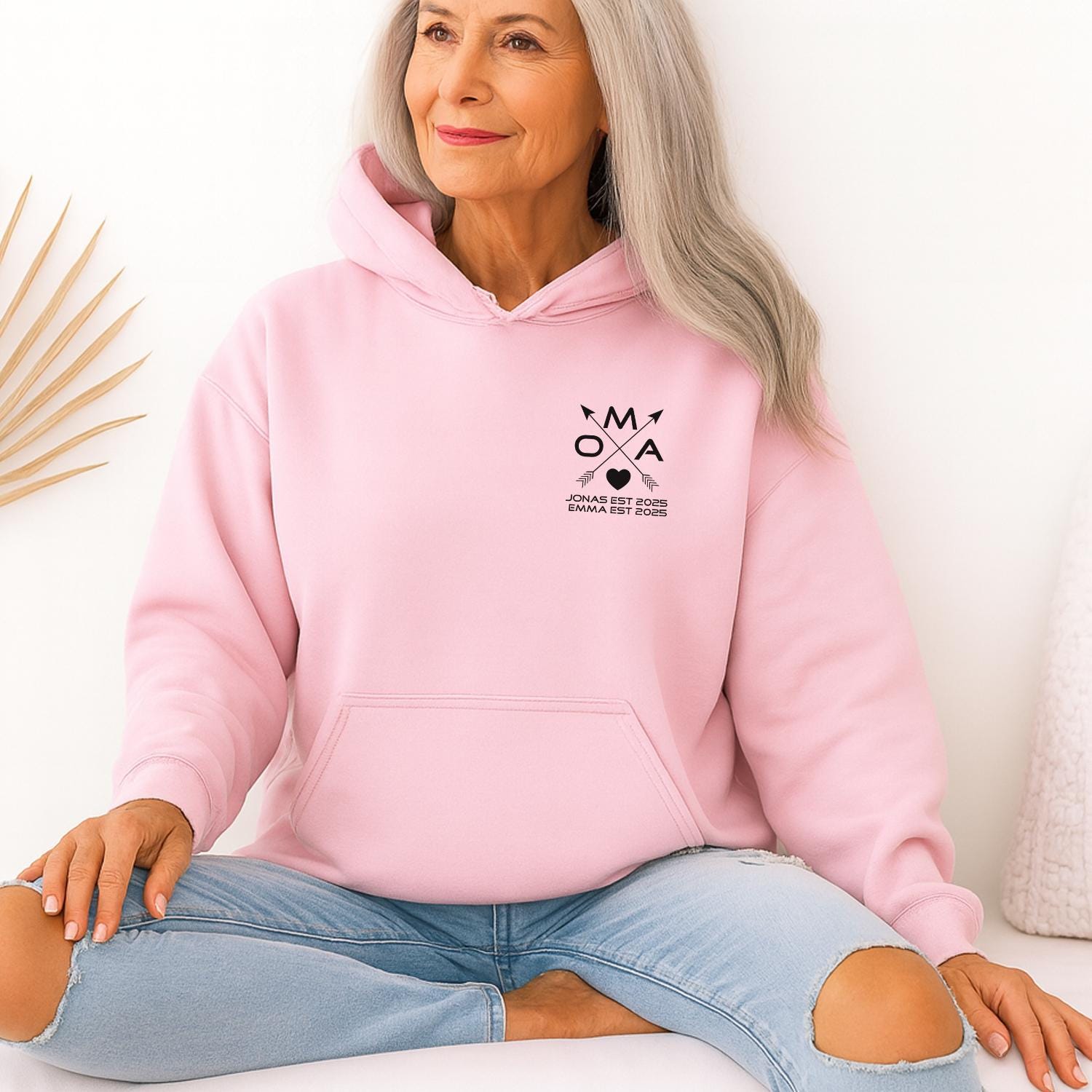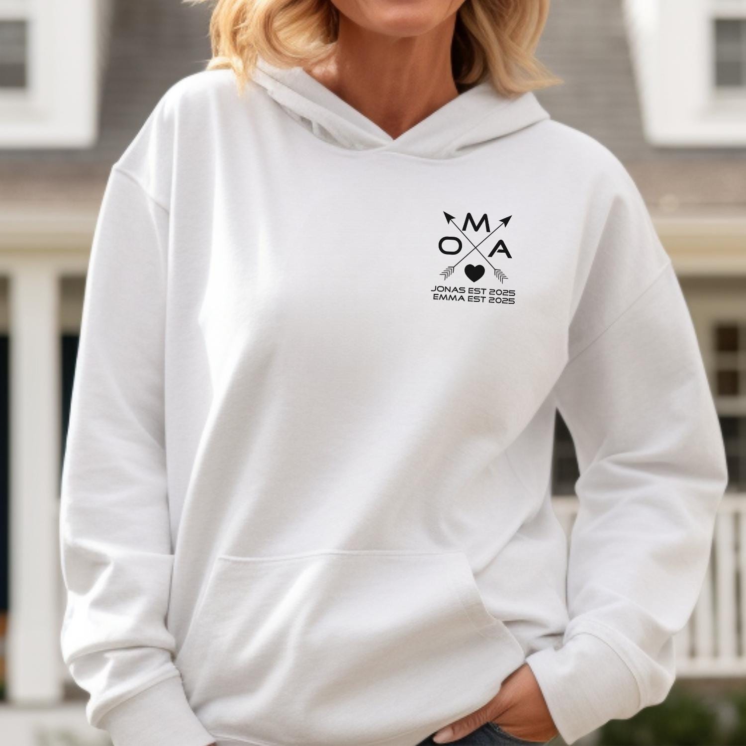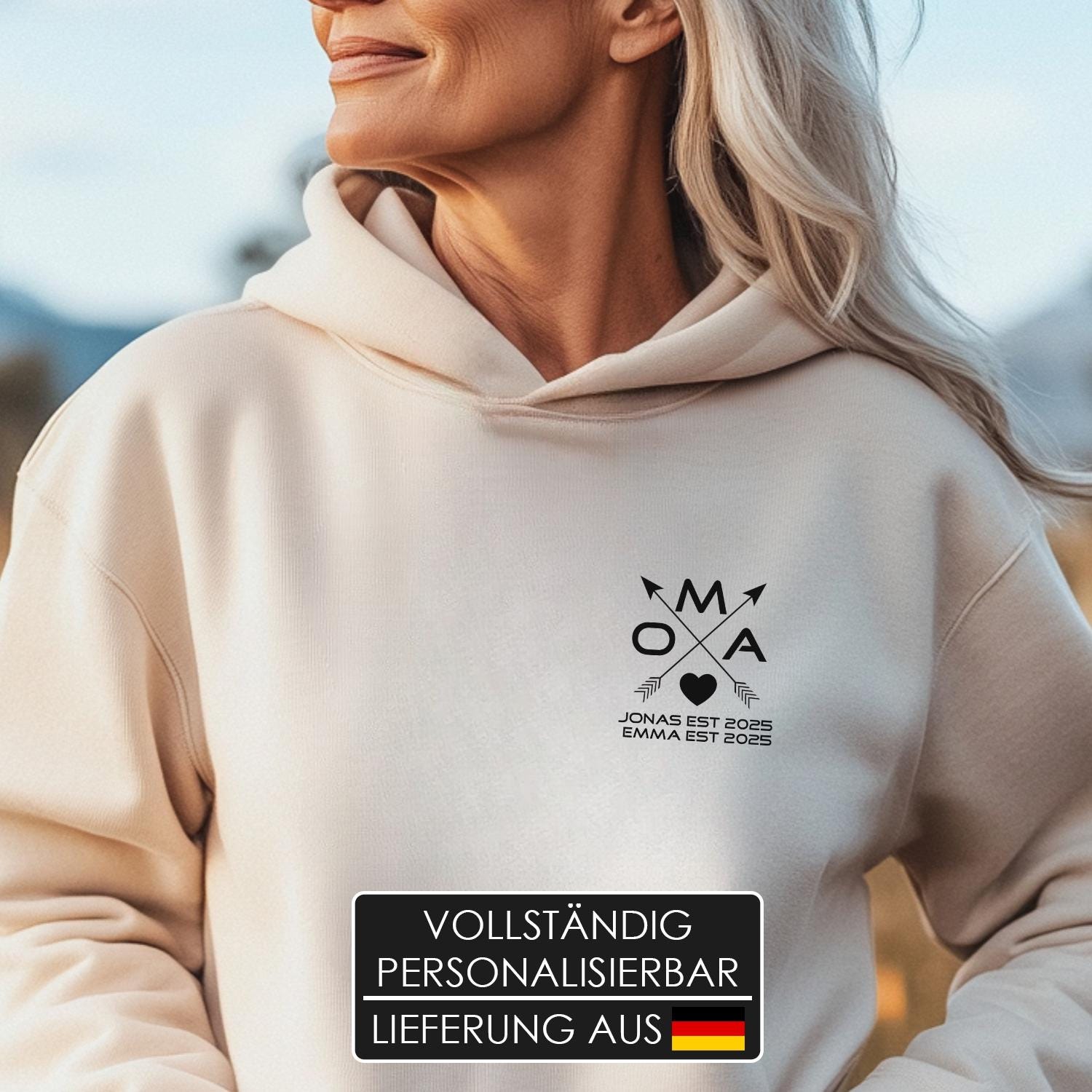 Du suchst nach einem einzigartigen und tollen Weihnachtsgeschenk für Deine Oma? Deine Großmutter verdient nichts von der Stange, sondern ein personalisiertes Weihnachtsgeschenk für Oma? Dann ist unser Hoodie mit der modischen und doch minimalistischen Personalisierung auf der Brust genau die richtige Wahl. Nenne uns einfach die Namen der Kinder und/oder das Geburtsjahr und schon fertigen wir ein Unikat, was Deiner Oma sicherlich die Tränen in die Augen treibt vor Freude.