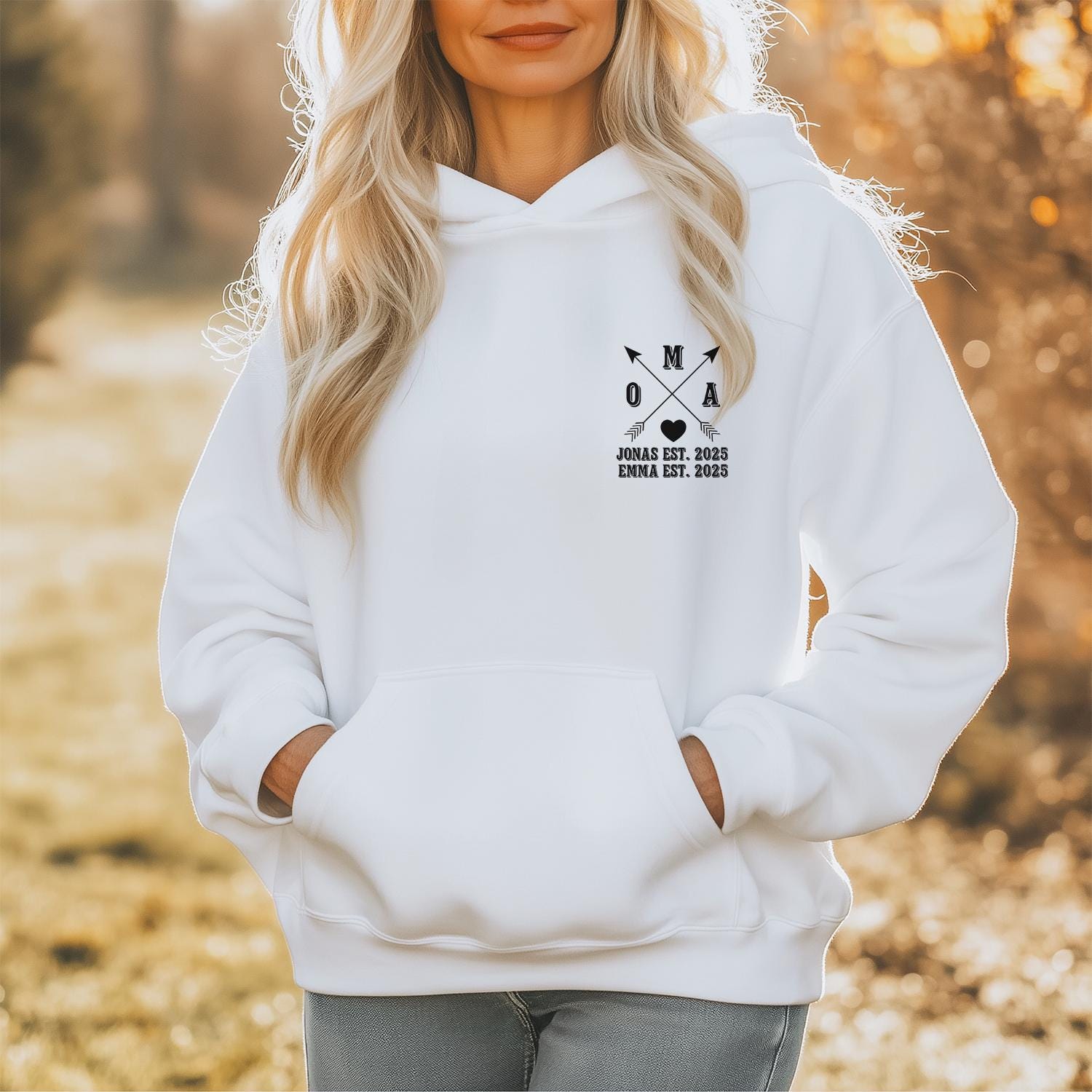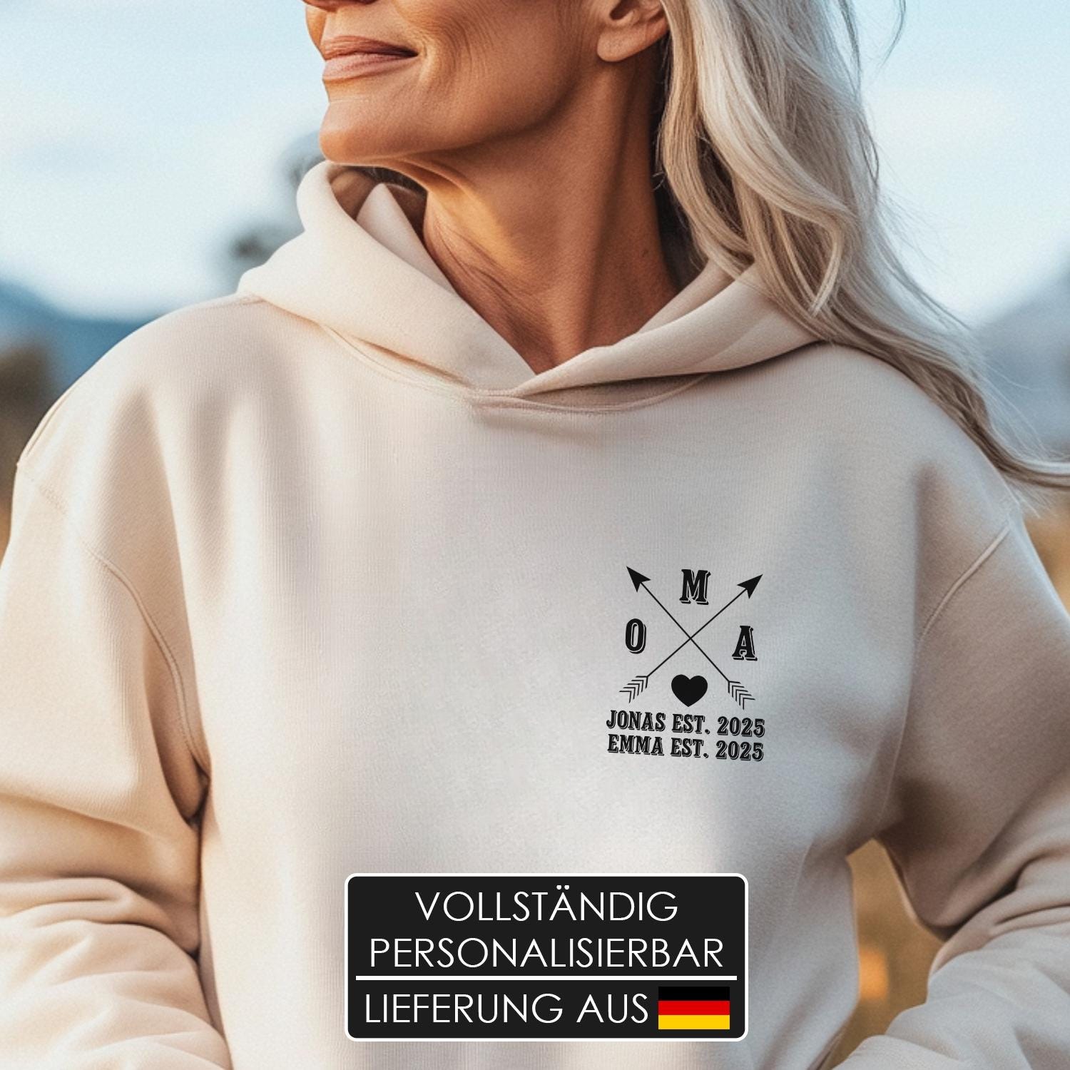 Du suchst nach einem einzigartigen und tollen Weihnachtsgeschenk für Deine Oma? Deine Großmutter verdient nichts von der Stange, sondern ein personalisiertes Weihnachtsgeschenk für Oma? Dann ist unser Hoodie mit der modischen und doch minimalistischen Personalisierung auf der Brust genau die richtige Wahl. Nenne uns einfach die Namen der Kinder und/oder das Geburtsjahr und schon fertigen wir ein Unikat, was Deiner Oma sicherlich die Tränen in die Augen treibt vor Freude.