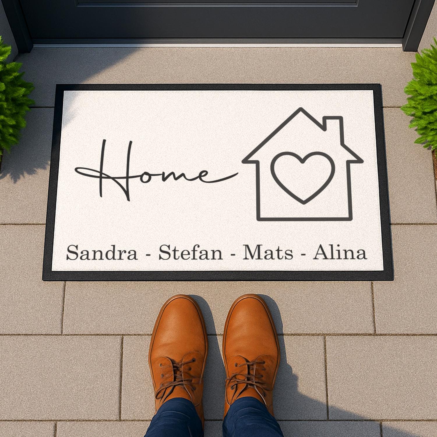 Ein Zuhause erzählt Geschichten – und schon an der Haustür beginnt die erste. Mit einer personalisierbaren Fußmatte setzt Du ein warmes, individuelles Zeichen für Familie, Liebe und Geborgenheit. Das moderne Line Art Motiv zeigt ein Haus mit Herz in der Mitte, daneben wählst Du zwischen den Worten Home, Family, Familie, Zuhause, Heimat oder Dahoam. Darunter lassen sich die Namen Deiner Familie einfügen – so wird aus einer praktischen Fußmatte ein herzliches Statement, das alle willkommen heißt. Robust, langlebig und mit persönlicher Note macht sie Deinen Eingangsbereich unverwechselbar.