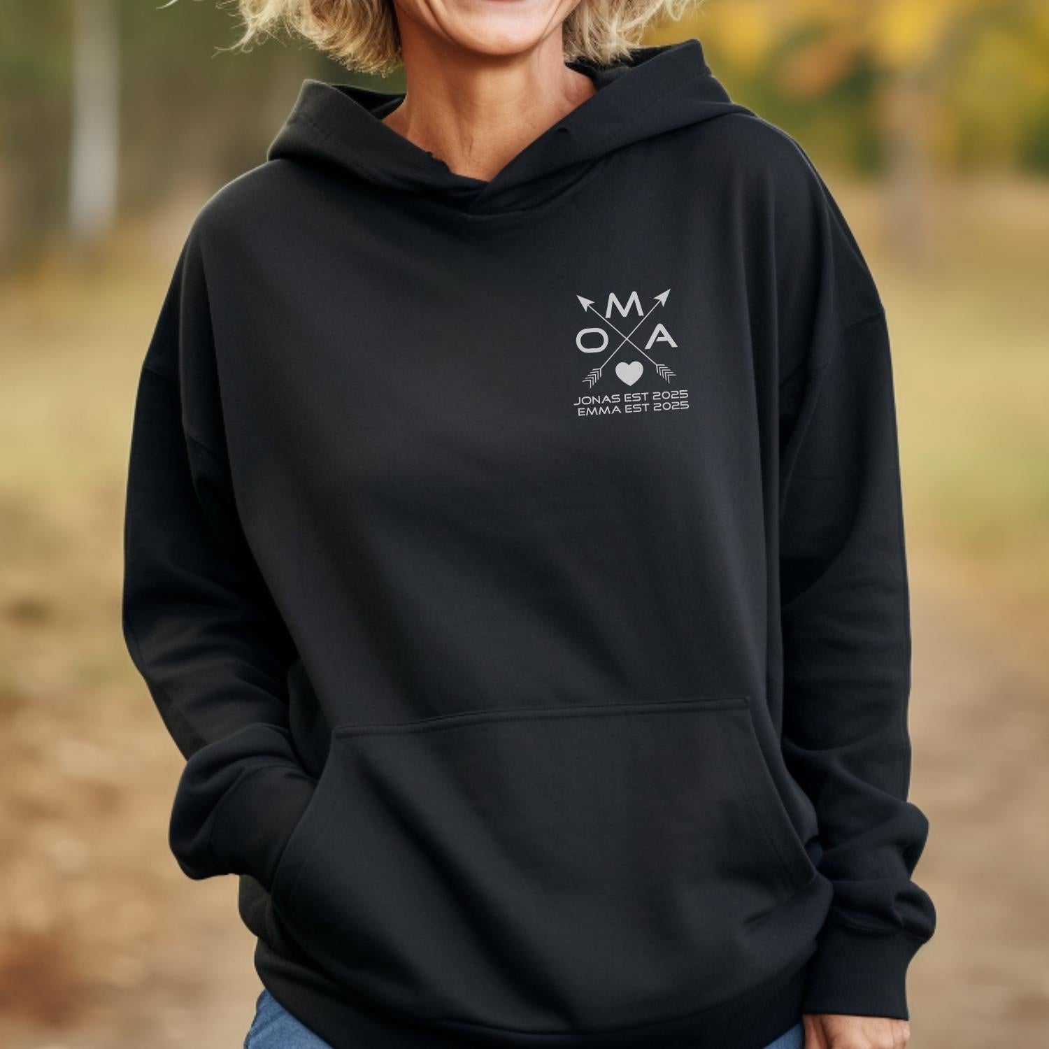 Du suchst nach einem einzigartigen und tollen Weihnachtsgeschenk für Deine Oma? Deine Großmutter verdient nichts von der Stange, sondern ein personalisiertes Weihnachtsgeschenk für Oma? Dann ist unser Hoodie mit der modischen und doch minimalistischen Personalisierung auf der Brust genau die richtige Wahl. Nenne uns einfach die Namen der Kinder und/oder das Geburtsjahr und schon fertigen wir ein Unikat, was Deiner Oma sicherlich die Tränen in die Augen treibt vor Freude.